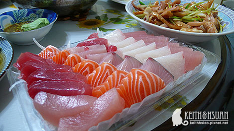 這一大盒共有鮭魚, 鮪魚, 海鱺魚...等五種魚